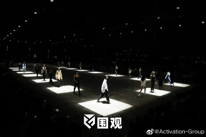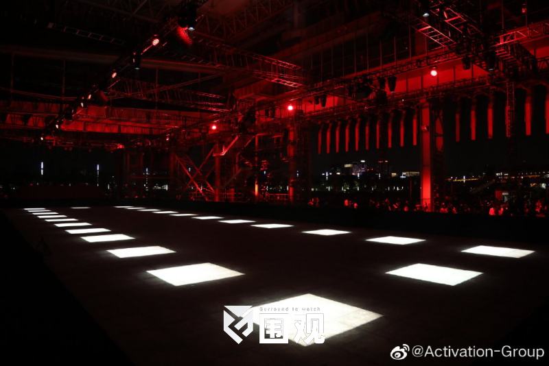 黄浦江边的工业空间中,以红黑主调的灯光变奏和镭射效果表演打造出略带未来感的秀场氛围。 (from ACTIVATION EVENTS SHANGHAI)