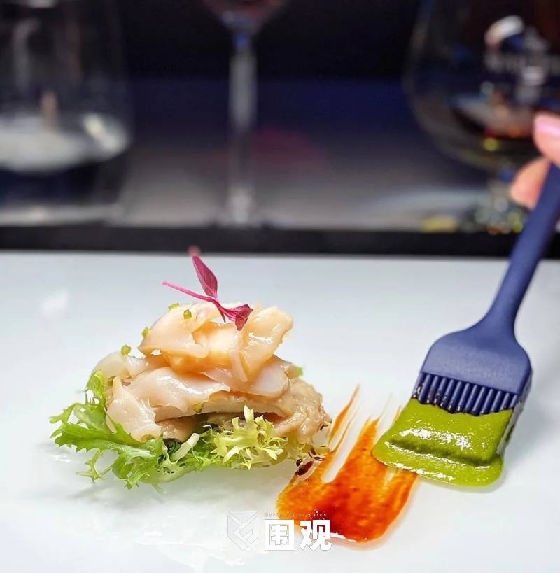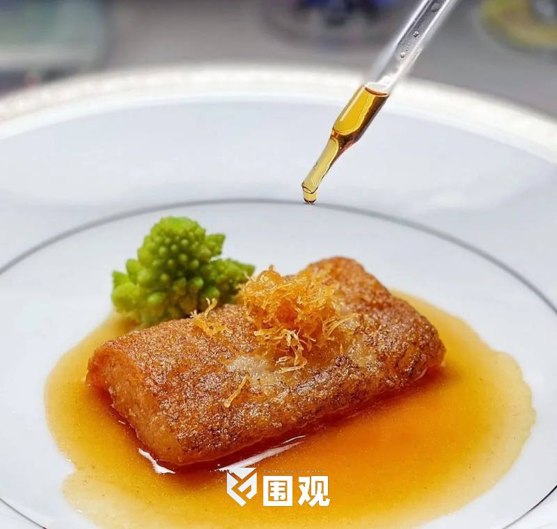 分子料理手法将南瓜文思豆腐羹做成蛋黄,塞到熏蛋白内,是神仙也难做的蛋。结构重塑,水墨纵横,笔锋如刀,从荧幕切到餐桌。