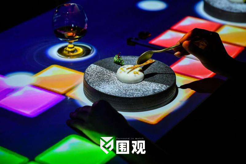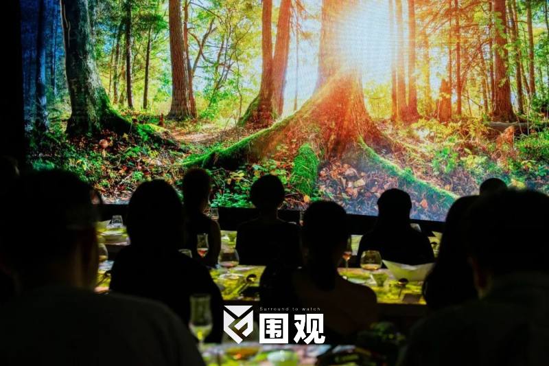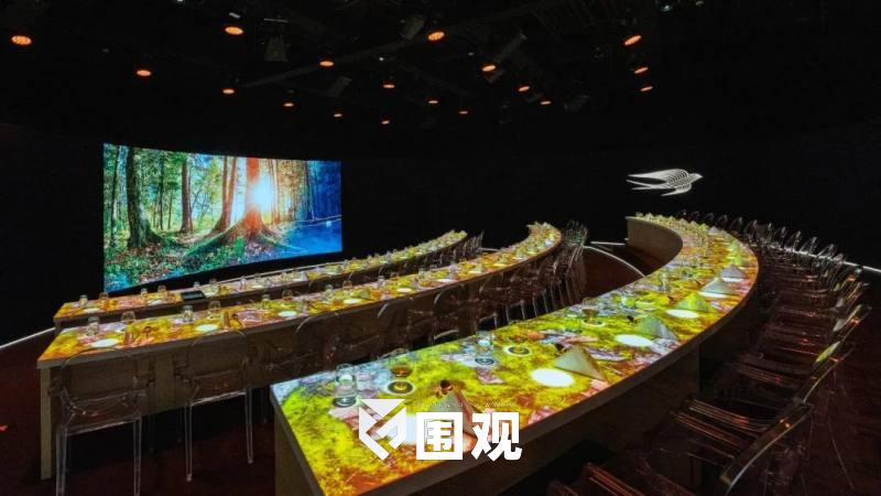 光影精准投射,三排桌面如三道弧光,承接着中心地带的渲染,音响环绕,光影如织,将我们的五感包裹其中。