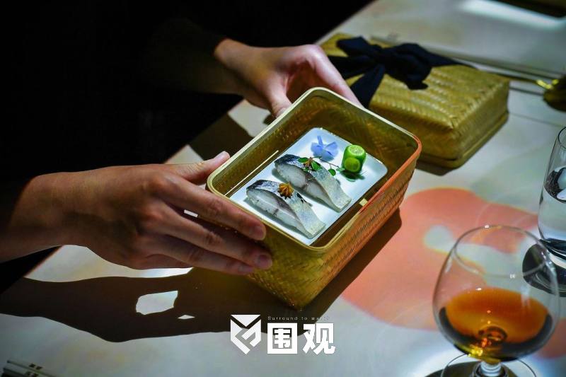 盐水煮的青花鱼,龙骨拿走,抽刀去骨,切件上桌,标上鱼子酱和加了味增的普宁豆酱,以竹筐呈盘。来自长崎的青花鱼肉质沉稳,肌理扎实,铭刻着古早味觉记忆。