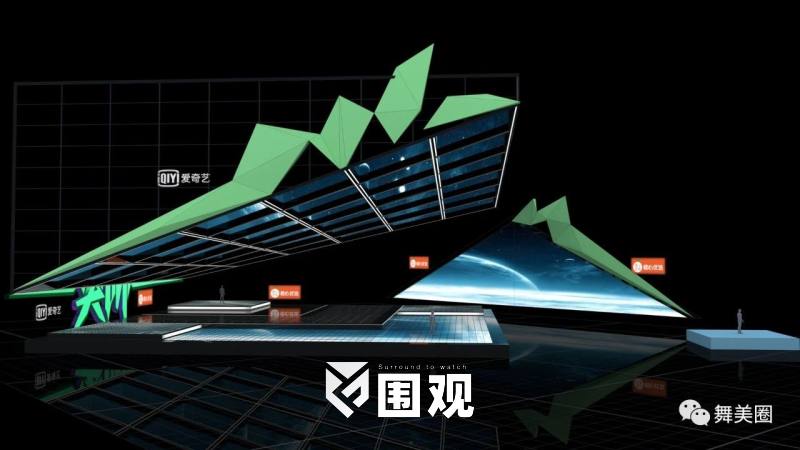 主舞台创意设计以心跳声音的律动感为中心,用logo做延伸概念,设计区别于以往对称式舞台的设计形式,主体轮廓看似为矩形,实则采取了倾斜“穹顶”舞台+多组L形LED屏幕的形式,打造“横看成岭侧成峰”的空间延伸感。
