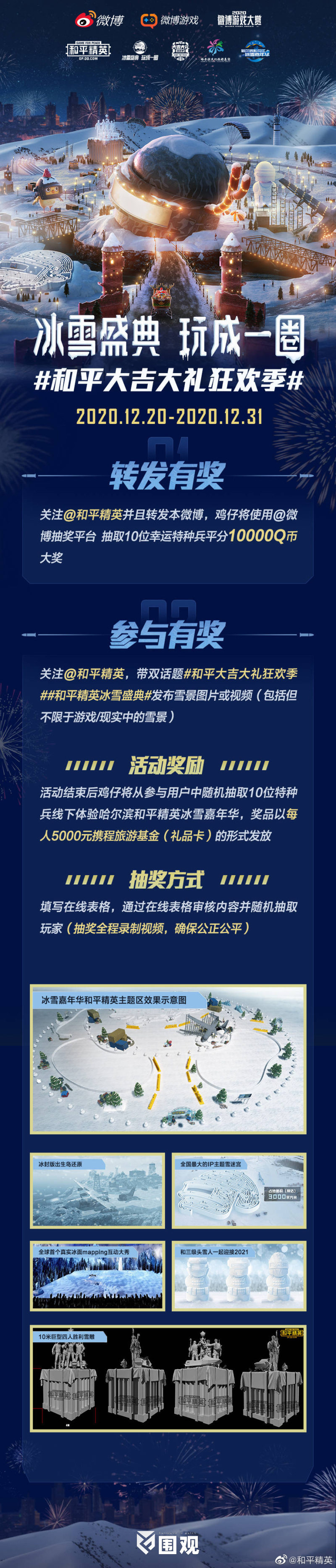 《和平精英》联合六届国际灯光节大奖艺术团队充分利用哈尔滨独特的冰雪资源,在零下三十度的松花江冰面上将虚拟投影、真人演员与静态冰面通过极具科技感的投影技术相结合创作了还原《和平精英》游戏真实体验的全球首个真实冰面投影互动大秀——《破冰进圈》开创冰雪艺术新形式