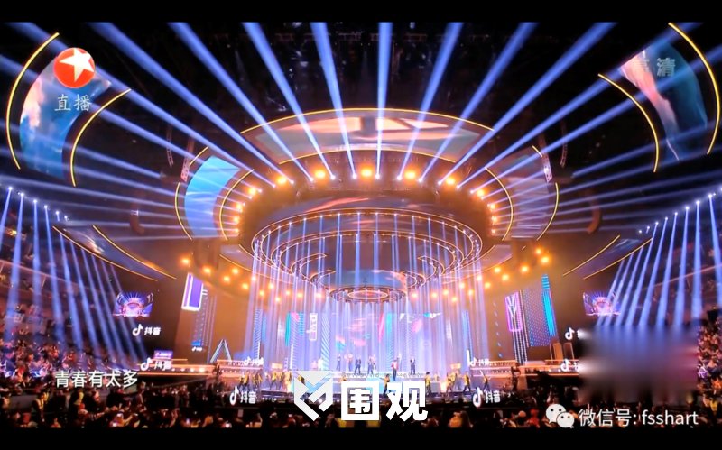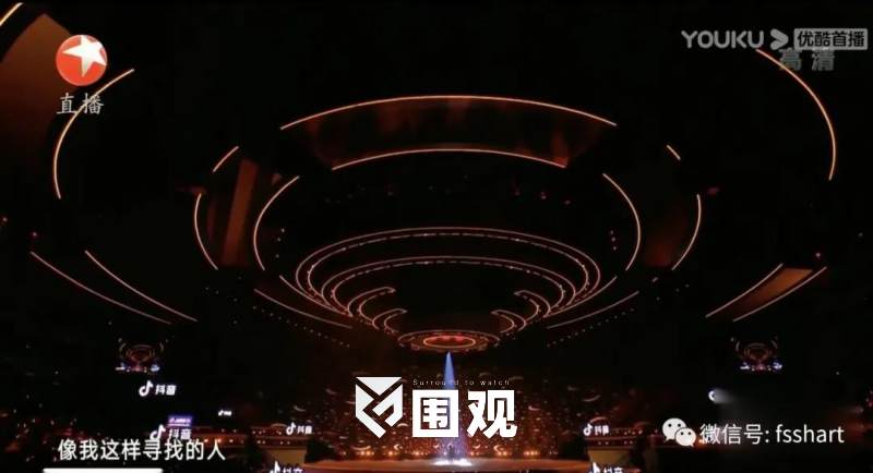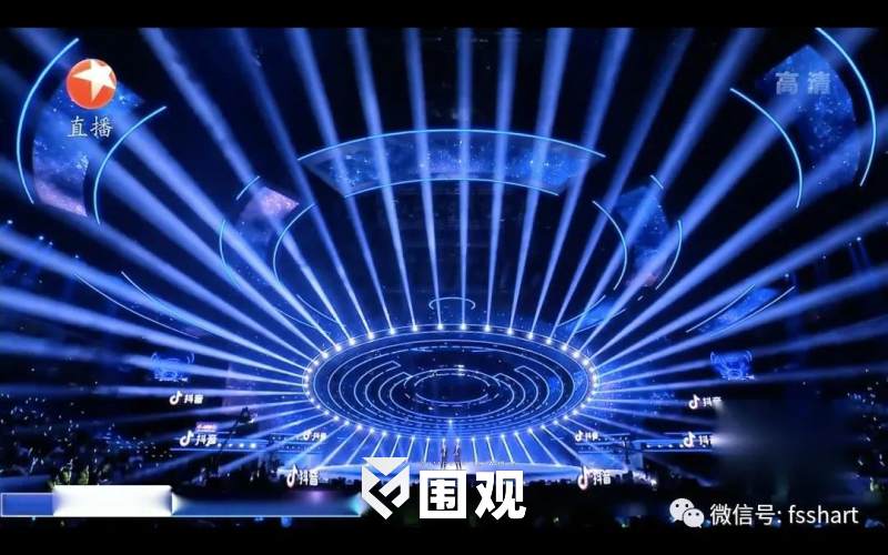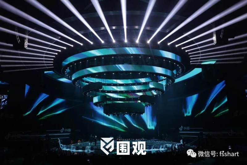 舞台基础造型既能提供舞美和灯光效果的统一,又能在舞台没有过多变化的时候,灯光也能独立体现节目所需效果,不被舞美牵制。除了五环螺旋式机械结构的内圈,考虑到上层观众及俯拍摄像机位的视觉效果,添加了多组多层耳光灯构成外圈,让舞美加以延伸,外圈内圈镜像式布灯方式自成一体,形成“滴水涟漪”的整体光效。