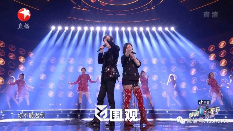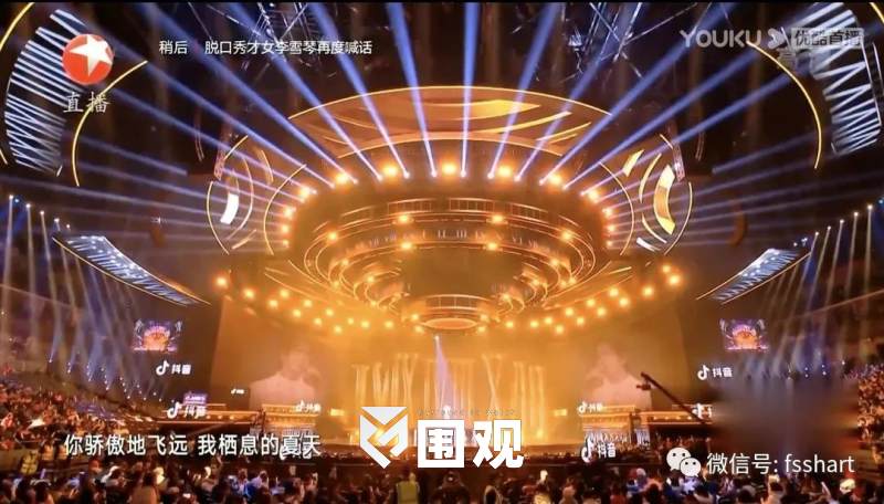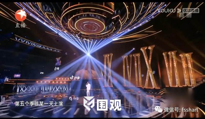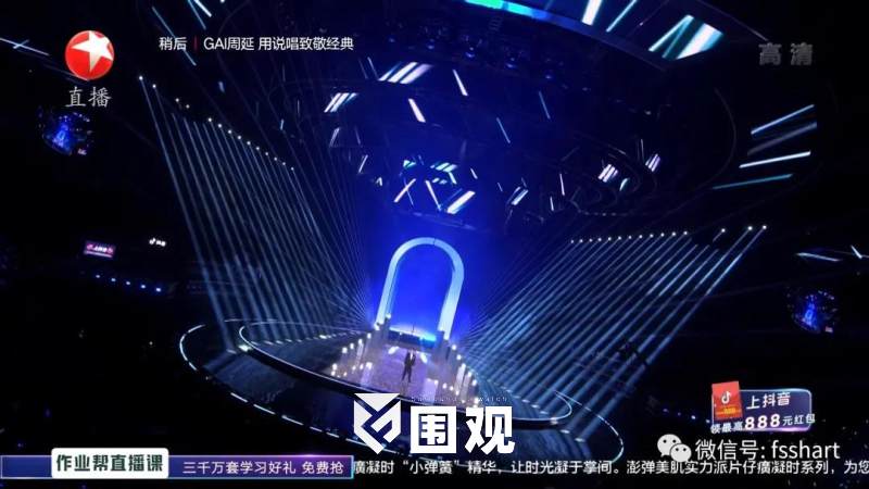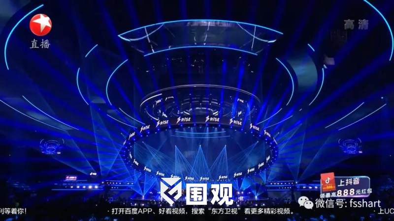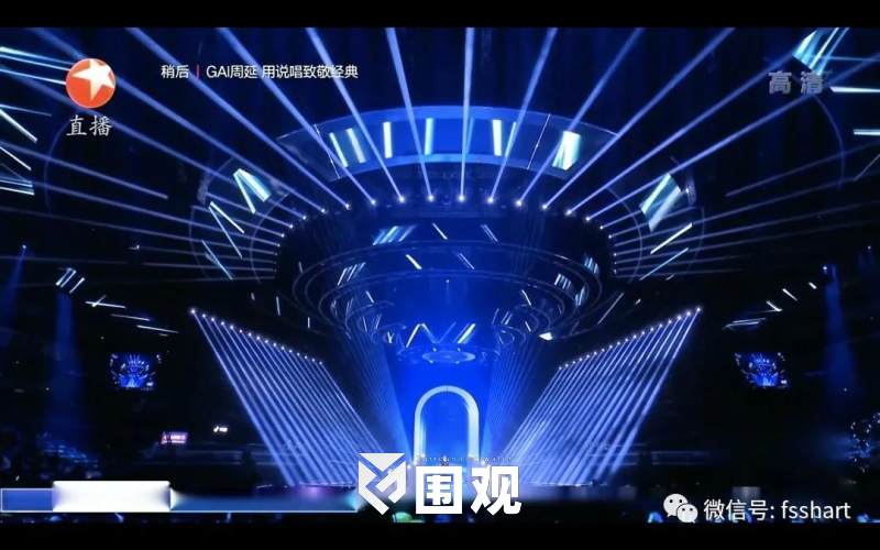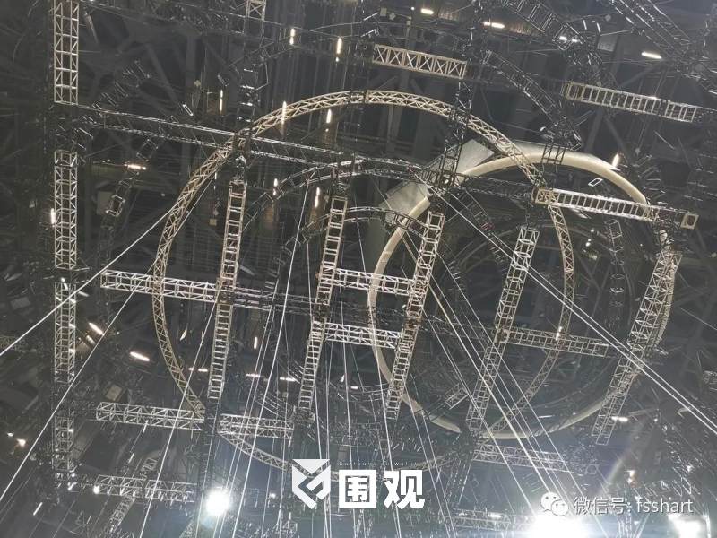 舞台上方的五层环型结构可自由组合解构,形成酷炫的风暴造型,紧扣“风从东方来”这一主题。灯光总设计师黄涛根据舞台的机械以及台型将灯光巧妙融入到五环中,精准把控每个灯位的高度与圆环之间的比例,让灯光收放自如。