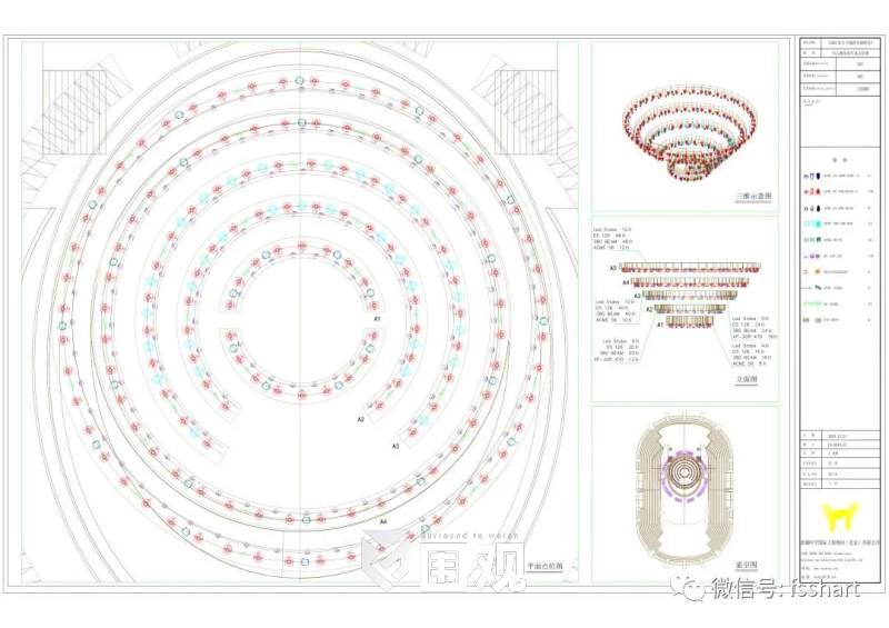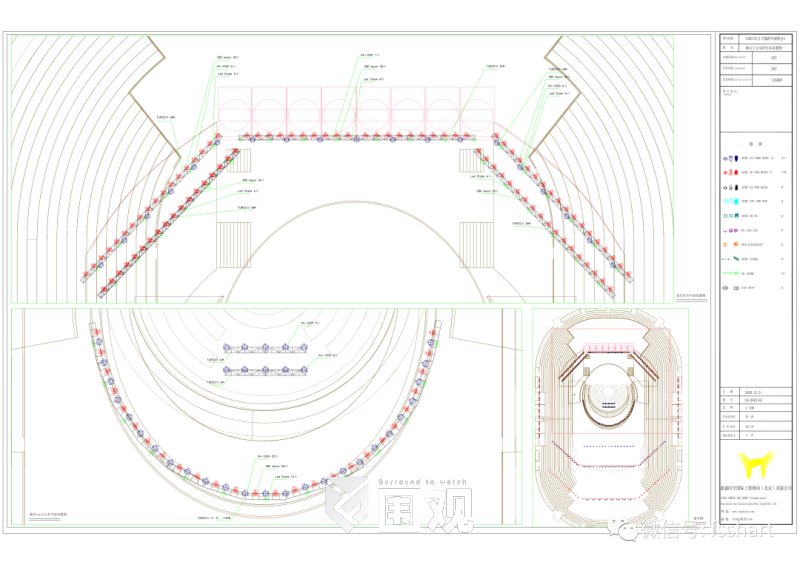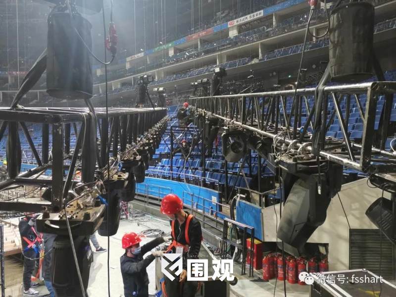 整个五环螺旋式的布光方式加入了各种各样的特效灯型、基础光的灯型,以台型为主加以灯光各个角度、方式、色彩的渲染及排列组合,使灯光不会喧宾夺主但是又无处不在,与舞美融为一体。