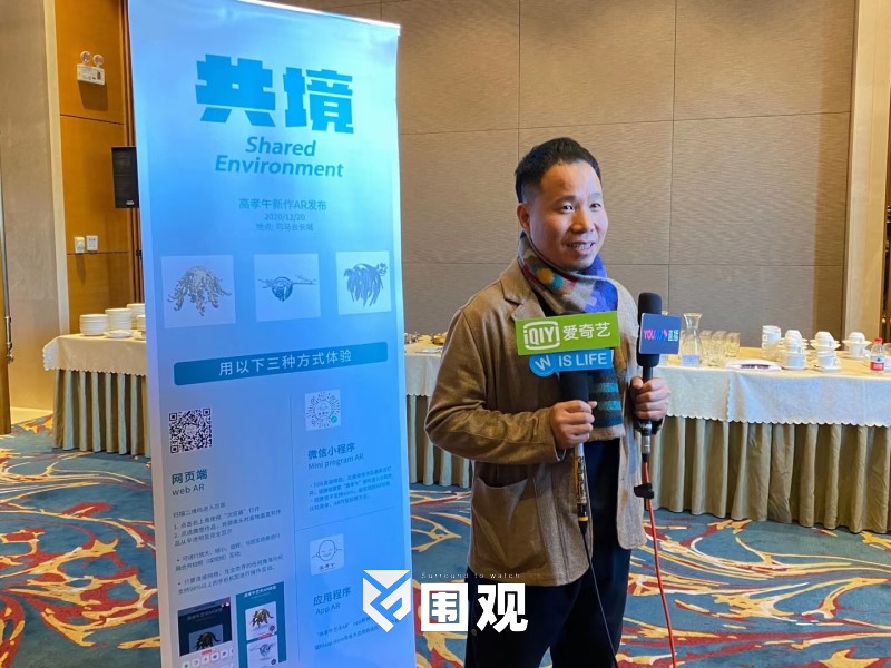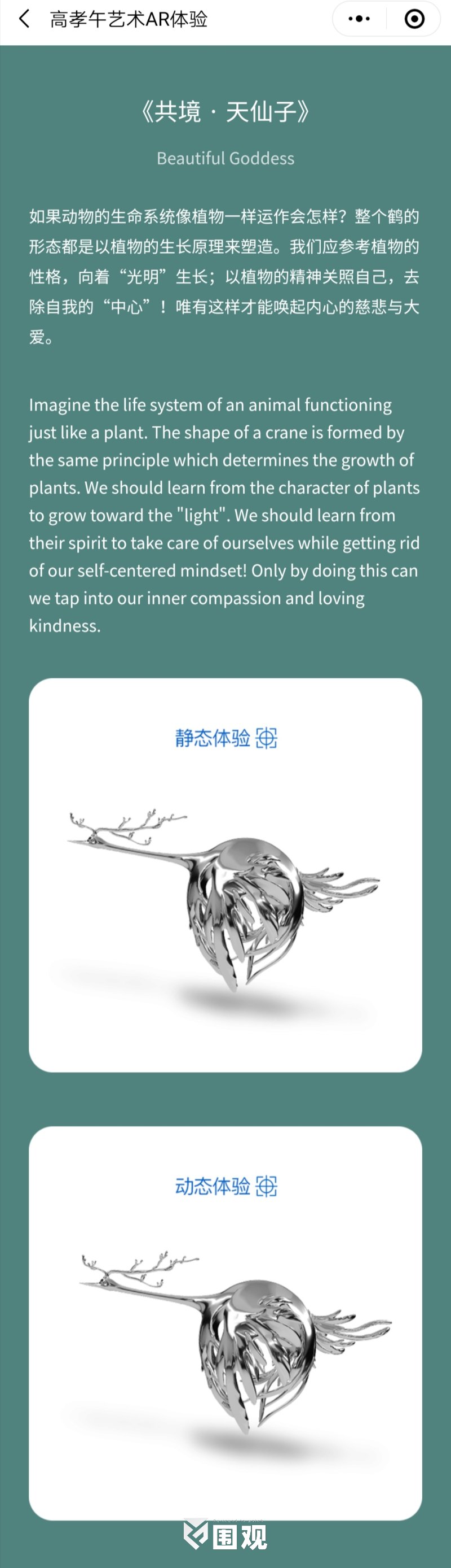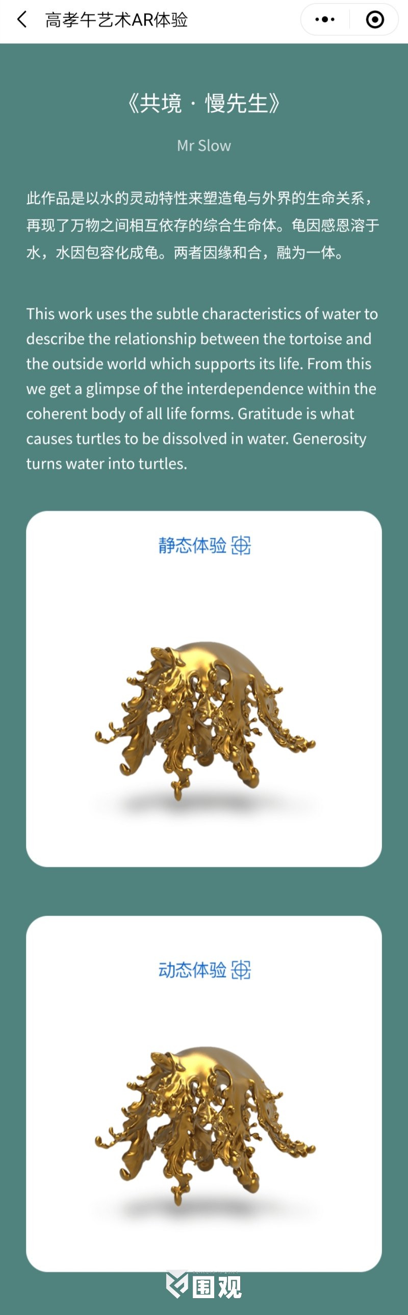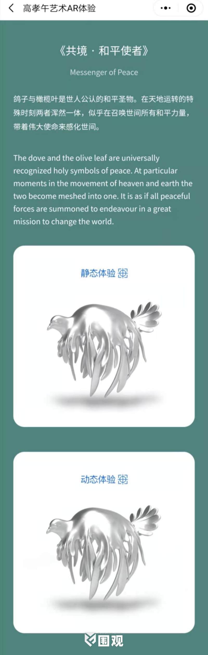 本次高孝午《共境》新作展示,采用AR增强现实技术,观众用手机扫描或识别二维码方式,进入web网址端或微信小程序、下载APP的方式均可体验,点选自己喜欢的雕塑作品,进行放大、缩小、旋转,与现实场景进行融合并拍照(或视频)互动。
