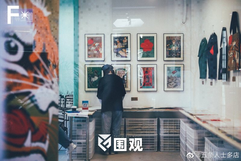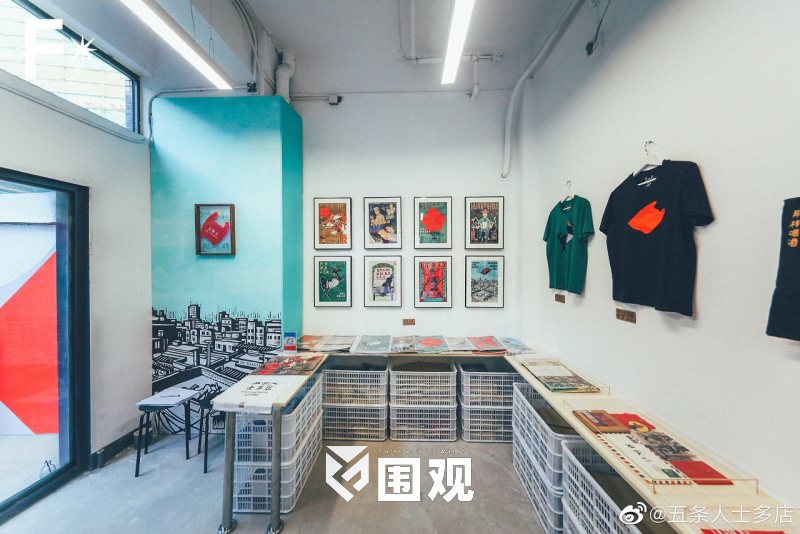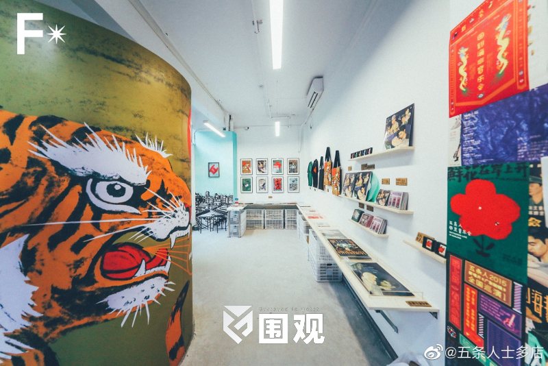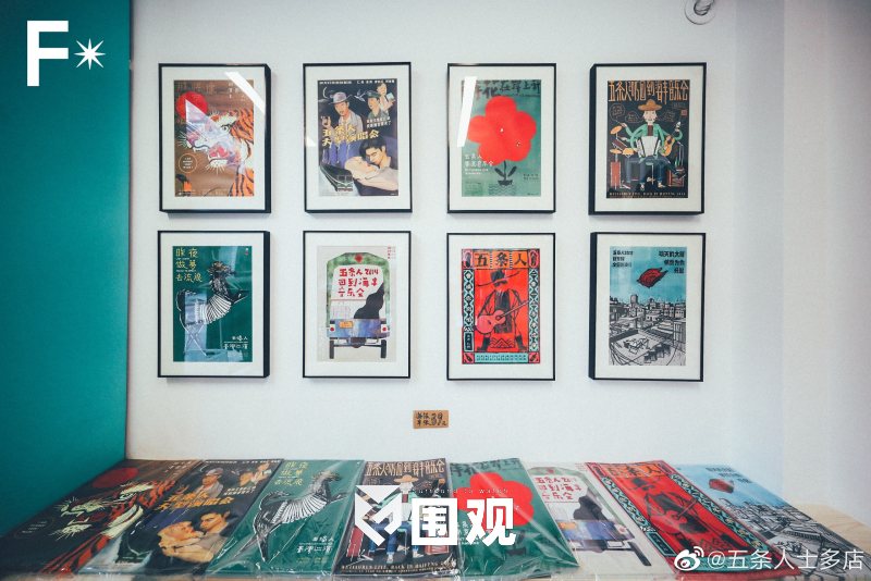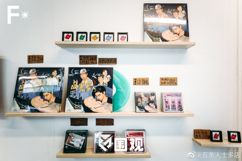 这家深圳实体店还有《故事会》的黑胶和绿胶售卖。同时还有一个小型的五条人视觉原作展——仁科手绘单曲封面原作、《故事会》专辑封面原作……