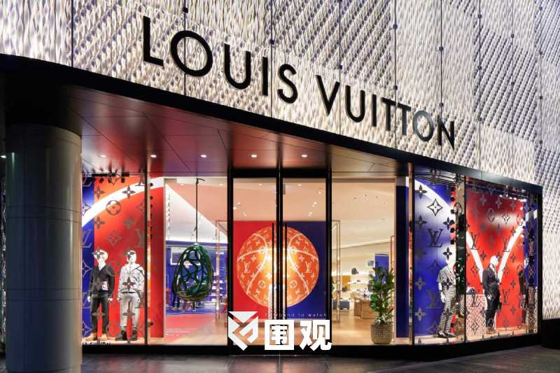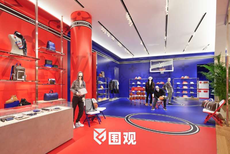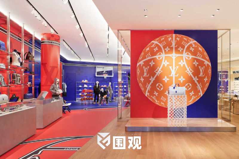 东京的LV店铺呈现了LV与NBA的限时快闪店。落地玻璃窗户上贴着白色LV的花押字,与背景中的NBA LOGO 红蓝色背景相互衬托。进门后,购物者就会看到一个巨大的篮球视觉效果,篮球上布满了LOGO,旁边是一个篮球场灵感的场景,里面摆满了仿真的篮球目标、球架、NBA官方球、储物柜和椅子。