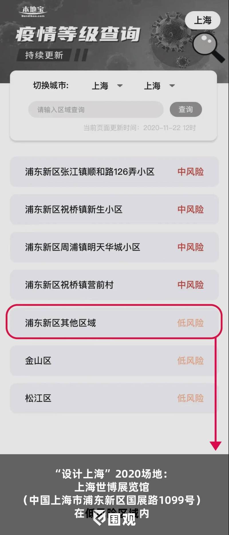 ”设计上海“经与展览馆和相关政府部门问询确认后,现告知广大展会参与方与观众朋友,展会将如期在11月26日-29日举行。目前,截至11月22日,上海浦东国际机场共关联新冠确诊病例7例。经上海市疫情防控指挥部研究决定,将浦东新区张江镇顺河路126弄小区、浦东新区祝桥镇新生小区、浦东新区祝桥镇营前村及浦东新区周浦镇明天华城小区列为中风险地区, 上海市其他区域风险等级不变 。