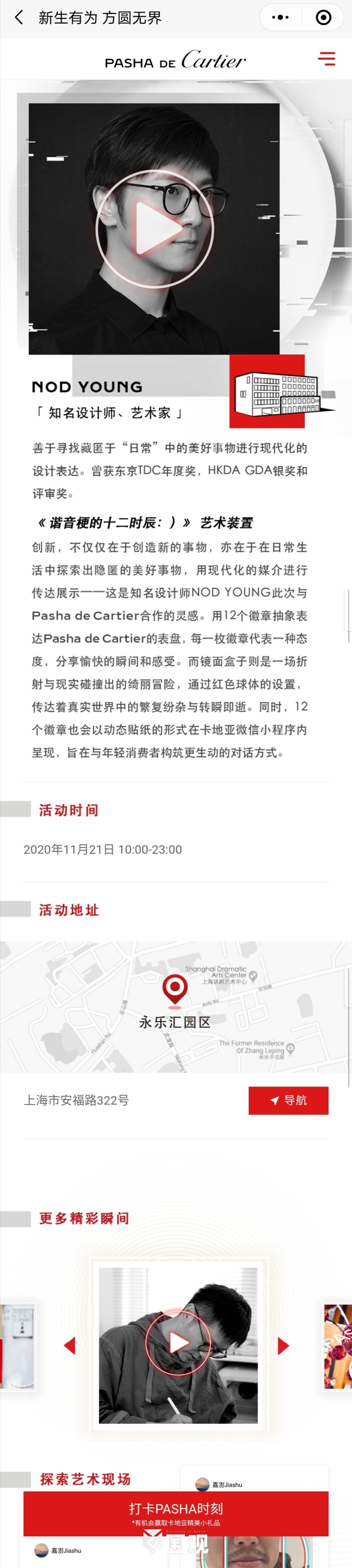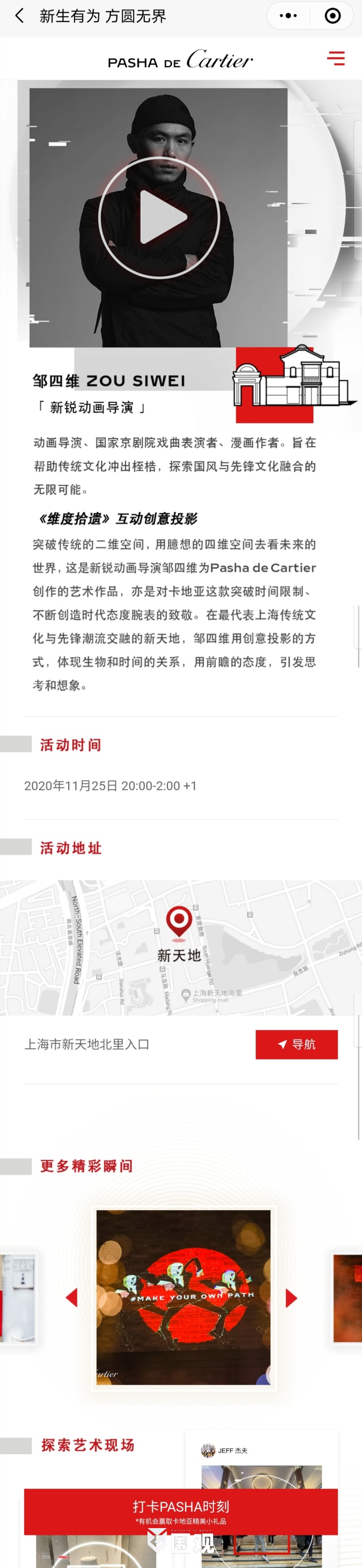 新锐动画导演邹四维 在上海新天地带来互动创意投影《维度拾遗》。他突破二维空间,用想象的四维空间去看未来,该作品也是他对PASHA DE CARTIER这款突破时间限制、不断创造时代态度腕表的致敬。