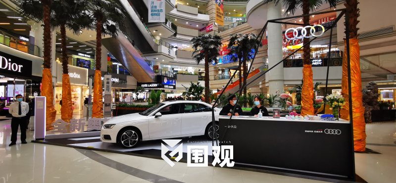 一辆展车、一个车辆说明牌、一个接待台、一名保安、两名工作人员