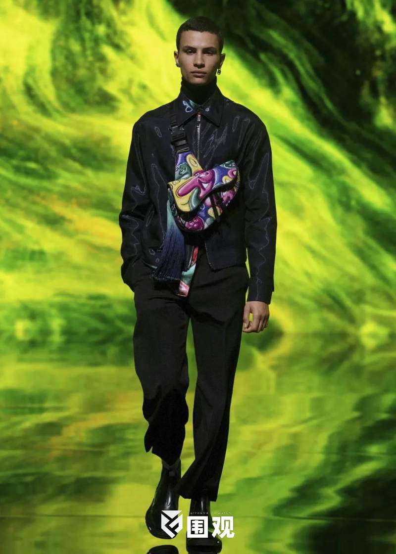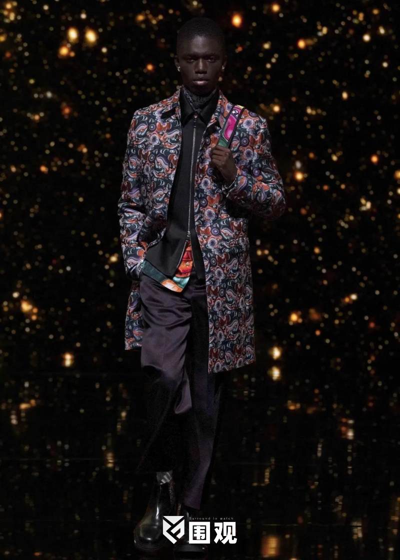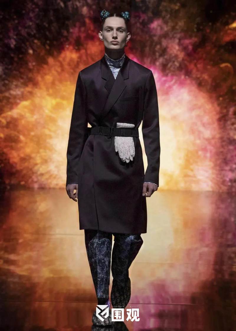 现场的四周伫立着巨型无边的LED屏幕,不断变幻的光影效果与点缀着的点点星辰,让人犹如坠入无边的宇宙,映衬了DIOR男装总监金·琼斯大胆追寻时空奥秘的开拓精神。