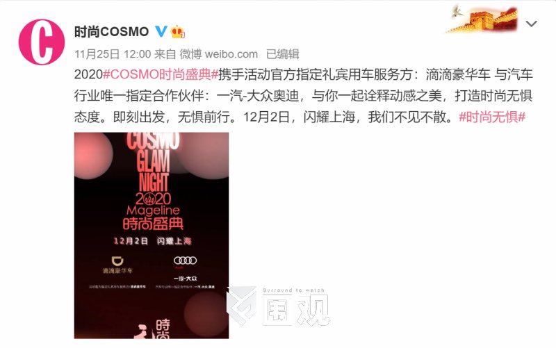 2020#COSMO时尚盛典#携手活动官方指定礼宾用车服务方:滴滴豪华车 与汽车行业唯一指定合作伙伴:一汽-大众奥迪,与你一起诠释动感之美,打造时尚无惧态度。即刻出发,无惧前行。