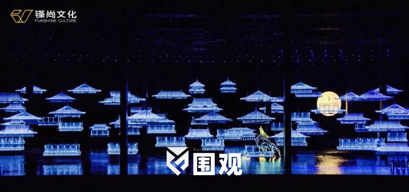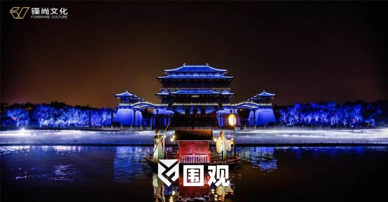 锋尚文化改变传统的固定观演模式,利用开阔水域,以“曲江盛宴”为原创题材,将观众席打造成一次可携800名游客的五艘观演游船,成就了演出的一大亮点。