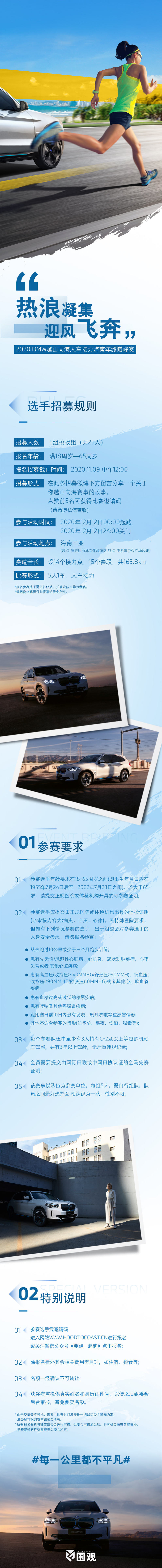 11月6日起,跑团招募正式开启,在“宝马中国”微博评论区留下你#每一公里都不平凡#的跑者故事,截止11月9日中午12:00,点赞前5名将有机会获得参赛名额,三亚等你!