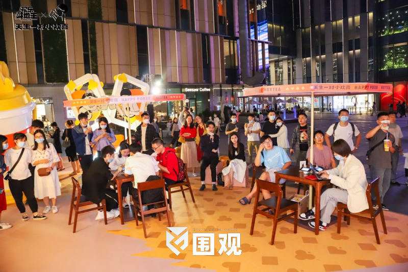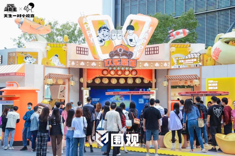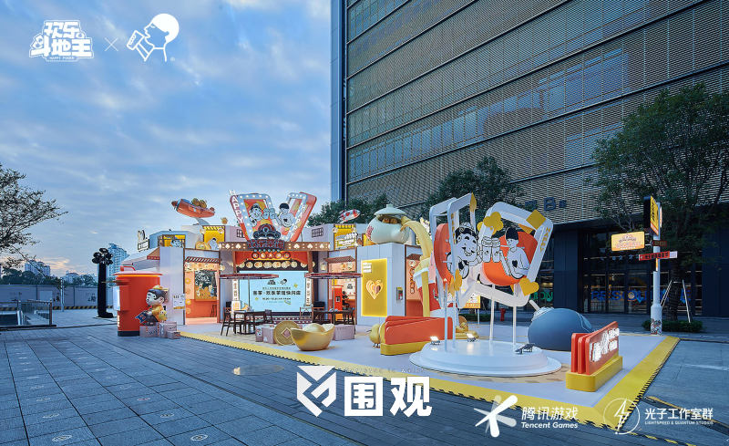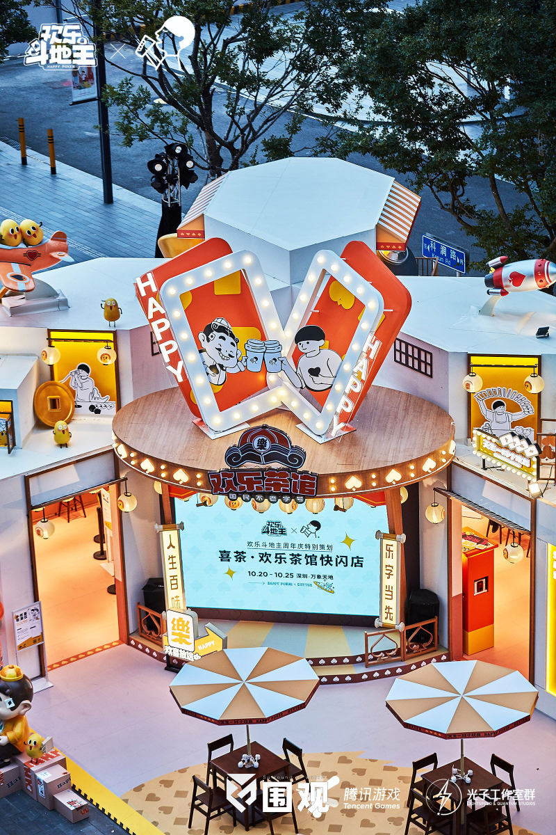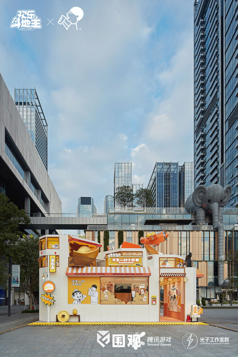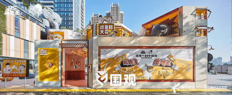 这次的“欢乐茶馆”以《欢乐斗地主》的橘色为主基调,还有游戏中随处可见的“黑话”和“游戏元素”营造出欢乐的氛围。在室外场景搭建方面,则通过将游戏中的扑克牌、地主、欢乐豆等经典元素与茶馆建筑外形融合为一体。在营造欢乐氛围的同时,与喜茶一起打造“喝茶、打牌”的新式欢乐体验。