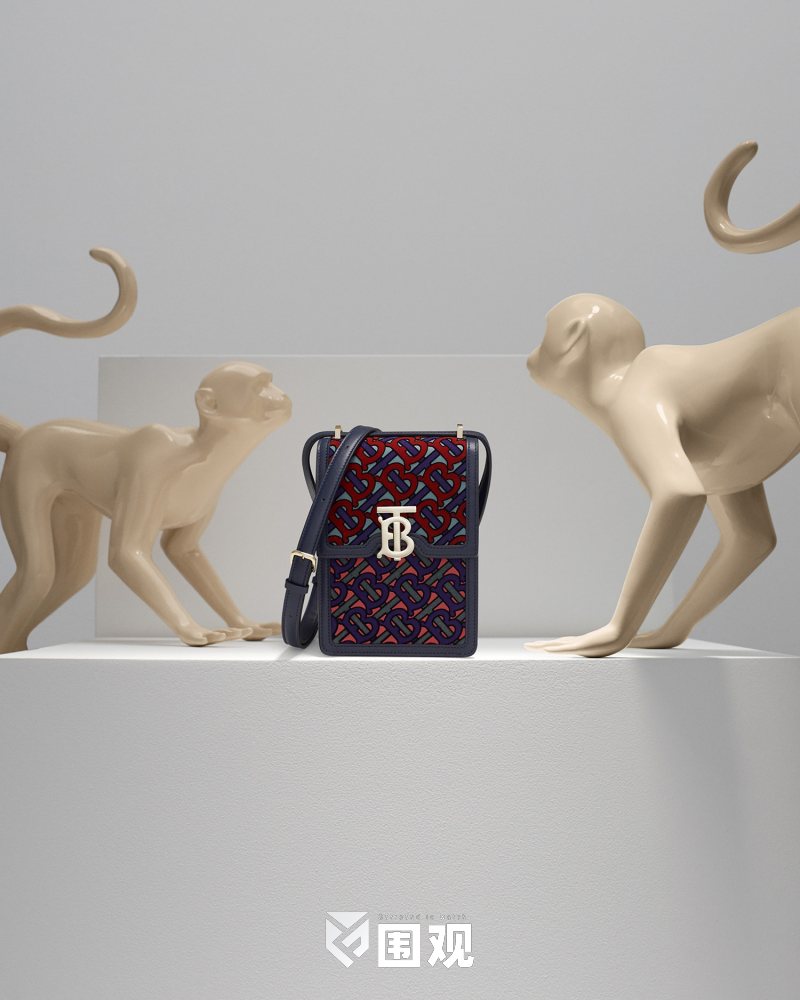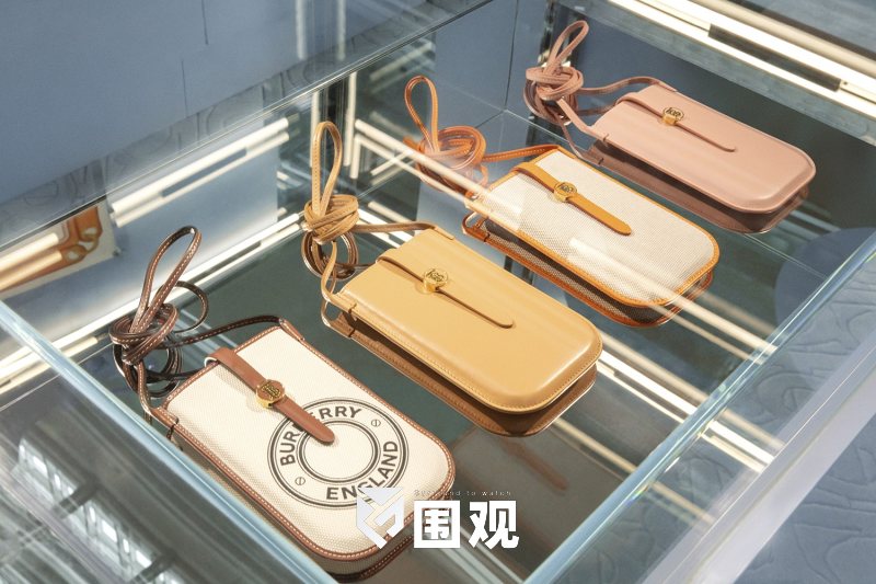 斜背式的皮革手机袋则是採用淡粉色、浅黄褐色和大地色搭配橘色滚边。以源自于马术的垂片盒Thomas Burberry花押字图样的锁扣来固定。