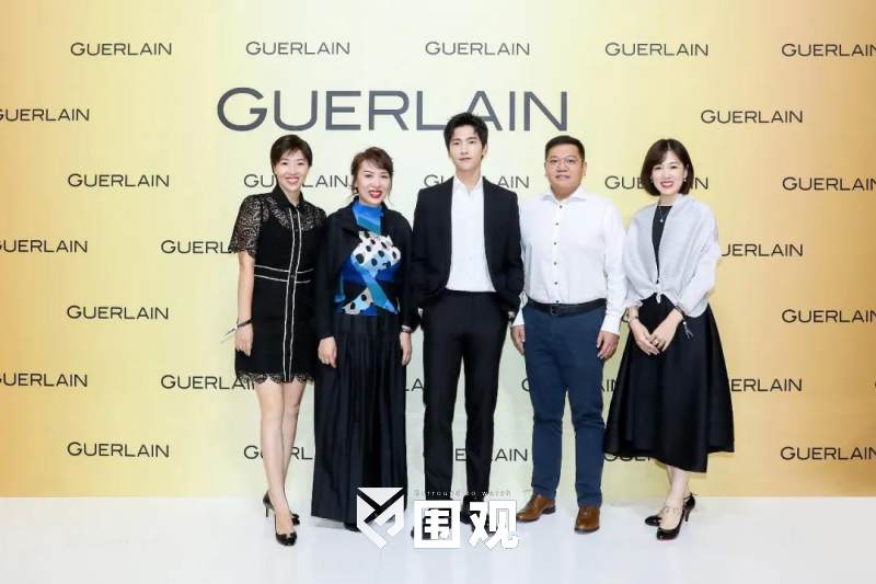 (从左至右:法国娇兰全国通路行销经理甘丽萍女士、北京恒城实业发展有限公司娇兰部总经理陈晓巍女士、法国娇兰代言人杨洋先生、沈阳万象城购物中心总经理骆晓麟先生、法国娇兰北京恒城区域销售经理田洪霞女士,同台合影留念)