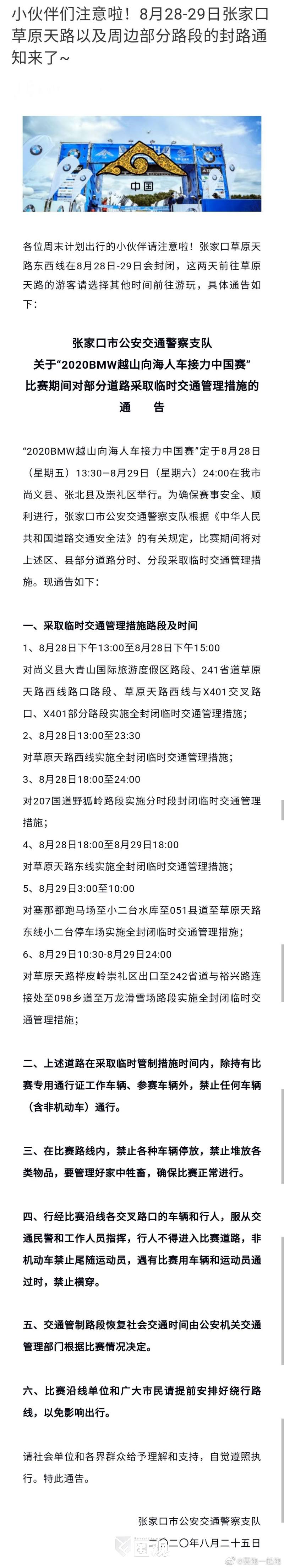 为确保赛事安全、顺利进行,比赛期间将对草原天路以及张家口市尚义县、张北县、崇礼县部分道路分时、分段采取临时交通管理措施,请参赛团队的后援团以及计划去草原天路游玩的朋友互相转告,以免耽误行程。