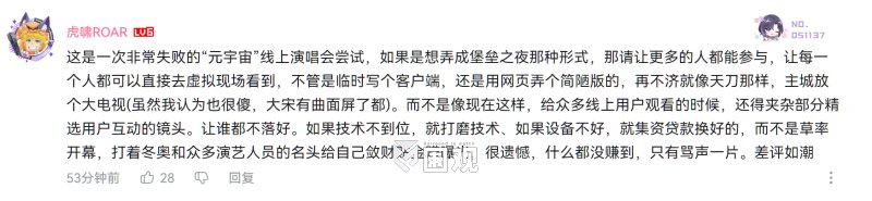 Leather说, 如果本次虚拟演唱会的场景使用的发布出来的信息一样的话 我个人认为, 虚拟场景,在短期期内(近3-5年内)最难的应该是“拟真” 纯虚拟抗空间,可能会相对简单 换句话说,这个虚拟演唱会没有什么可关注的
