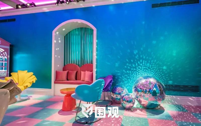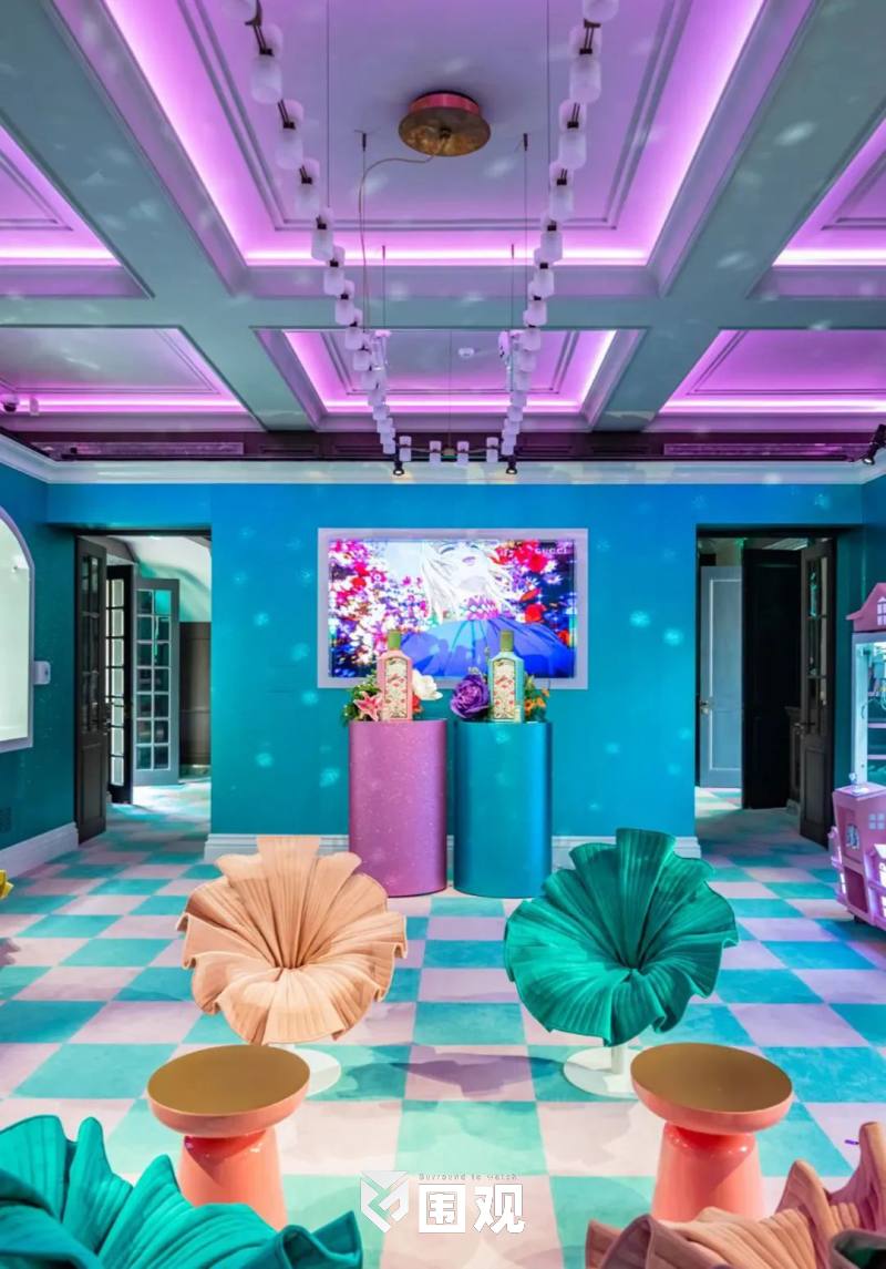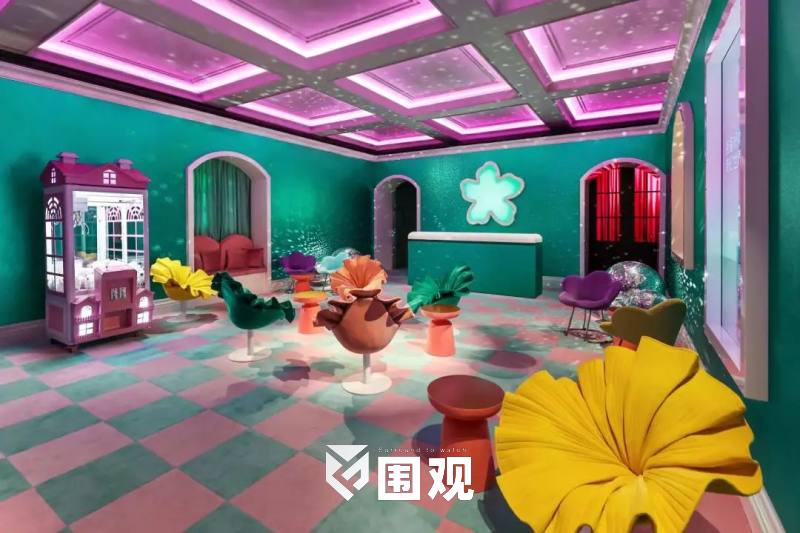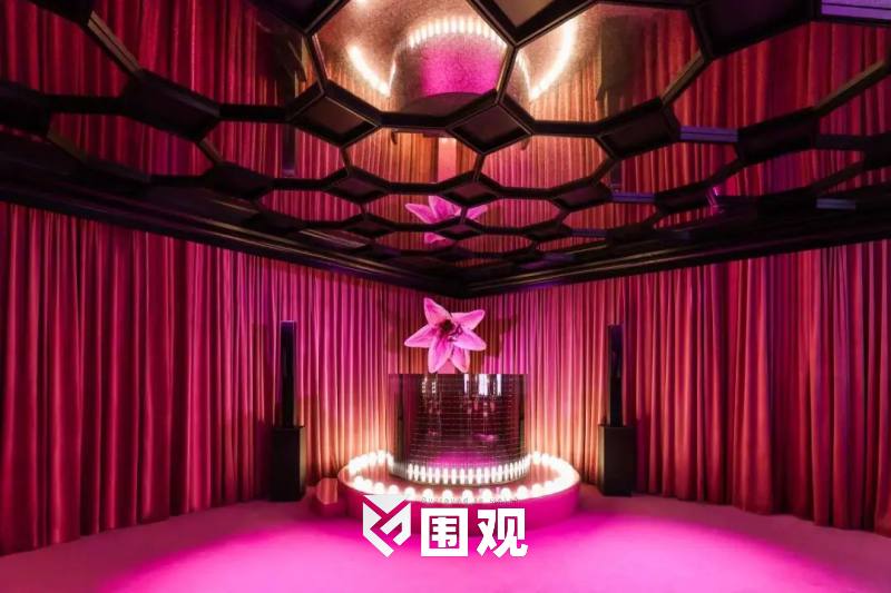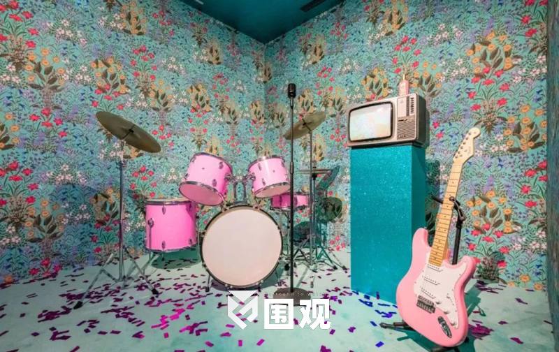 品牌经典的FLORA花卉图腾、复古电视机、粉红色架子鼓以及熠熠生辉的迪斯科球在绮梦卡拉OK区域陈设,饱和的色彩让人身临其境。