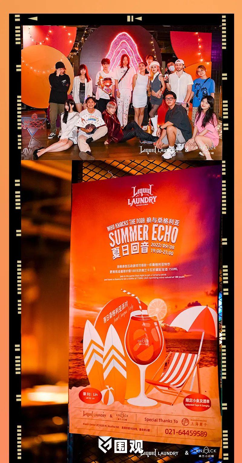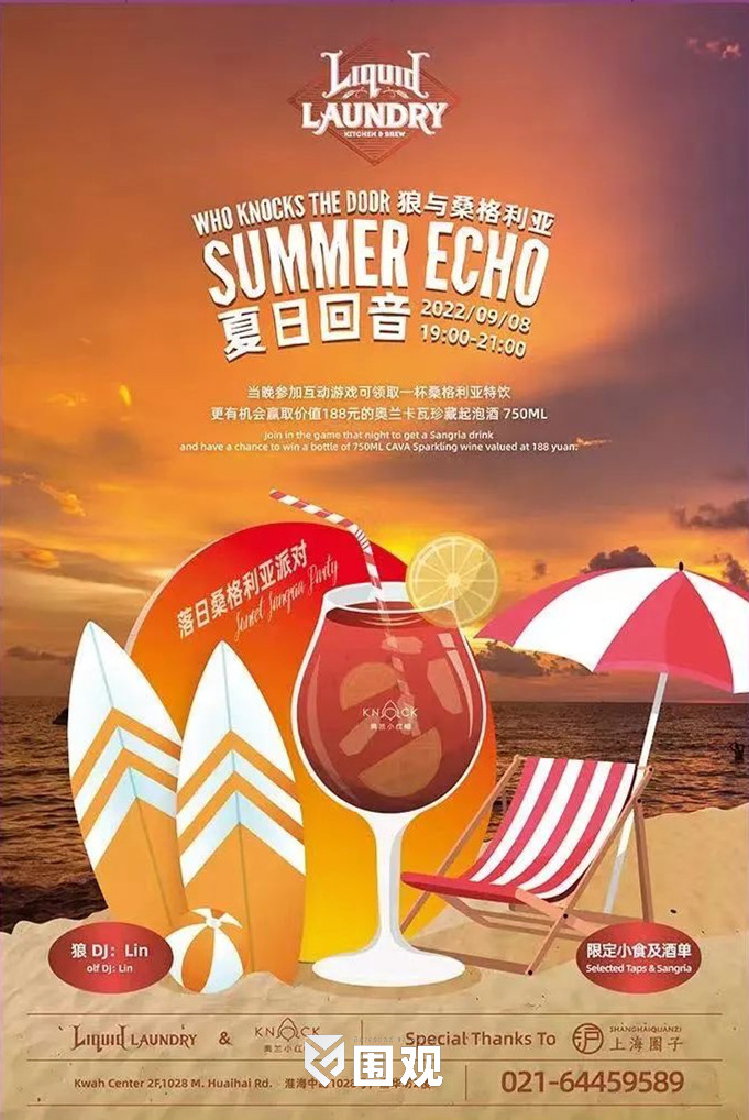 Liquid Laundry携手奥兰小红帽开启夏日回音-落日安可派对。在夏日的回音消散之前,为Sangria再次举杯,一起享受这段狂欢之旅! 清爽美酒、主厨特制小食、热情DJ...种种颠覆感官的体验都在这儿了!在夏天消失之前,再次举起酒杯,奔赴下一次的夏日派对!落日余晖中,我们在Liquid Laundry相聚,一起分享美食,举杯攀谈,微醺摇摆,抓住独属于这个夏天的美好回忆,也共同期待着下一场夏日故事的延续。