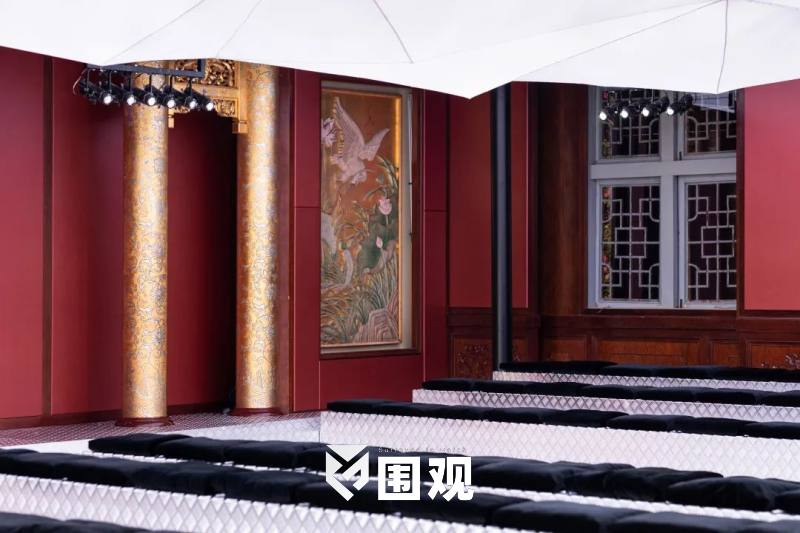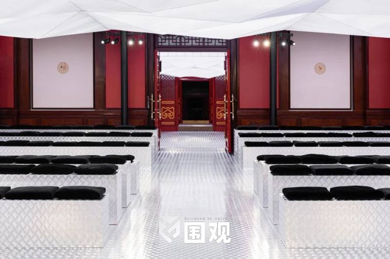 本次时装秀在郡王府银安殿发布,由AMO创作置景,ACTIVATION EVENTS最终呈现秀场空间。透明天花板与立体三角形空间的垂直隔板投射温馨柔和的粉色灯光,与府邸庭院池塘中的倒影相映成趣。地板与落座区域覆以防滑金属板,镜面设计增强光线与色彩,与精致照明元素形成鲜明对比。